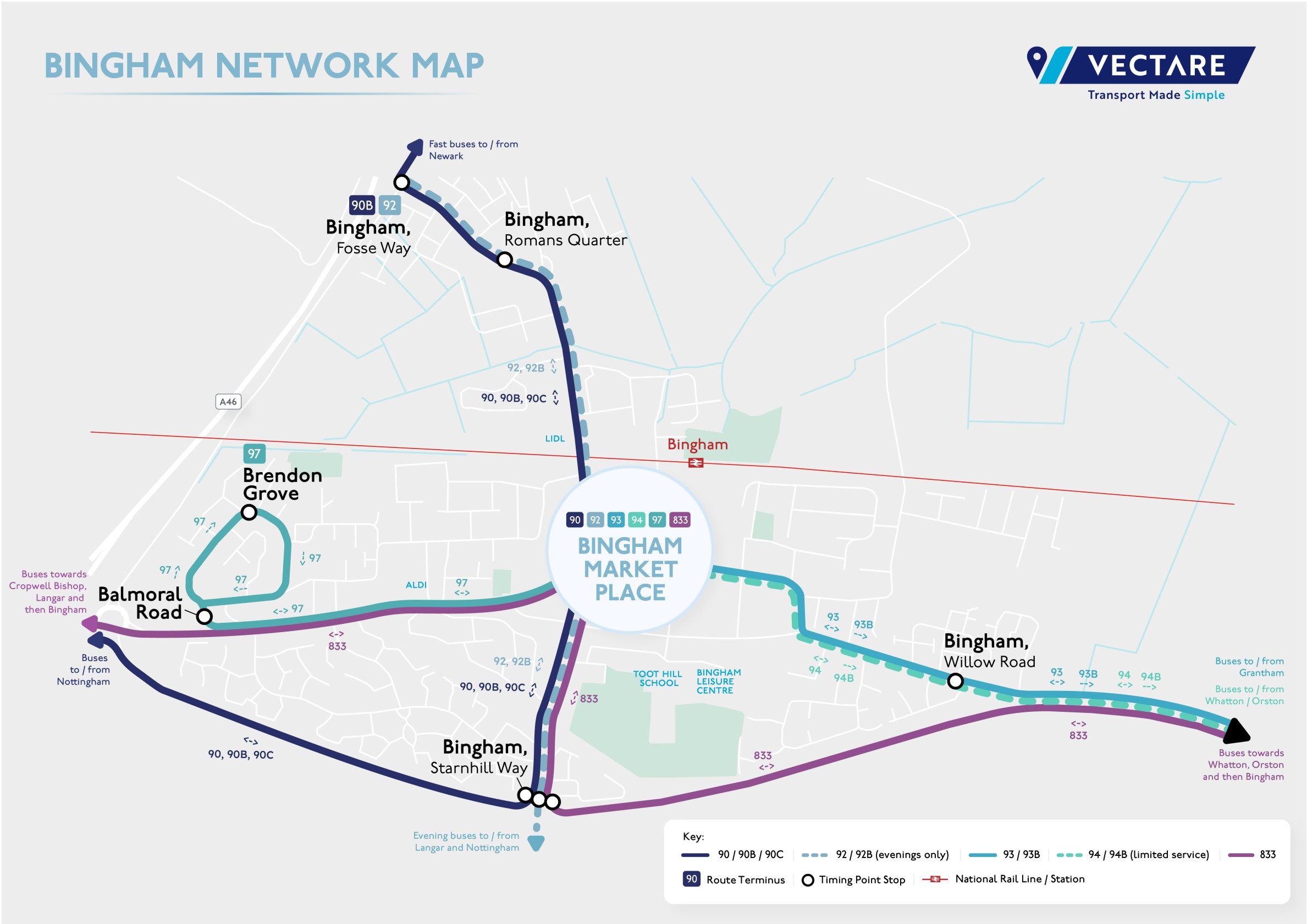 Vectare operate a small network of local town services within Bingham connecting in the Market Place. A summary map of these services can be found below.