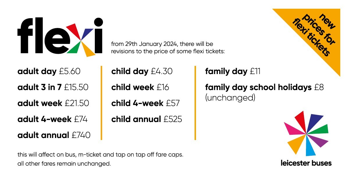 Following an annual review there will be changes to the price of Leicester Flexi multi-operator tickets from Monday 29th January. A summary of all prices changes is shown below.