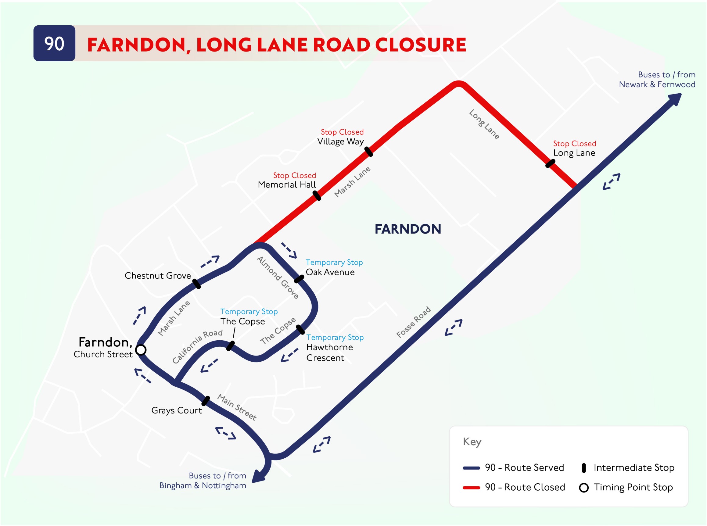 On weekdays only, from Wednesday 17th to Monday 29th April, Long Lane in Farndon will be closed between the hours of 09:30 and 15:00. During these times Service 90 will need to divert via Fosse Road and will only be able to enter and exit Farndon village via Main Street.