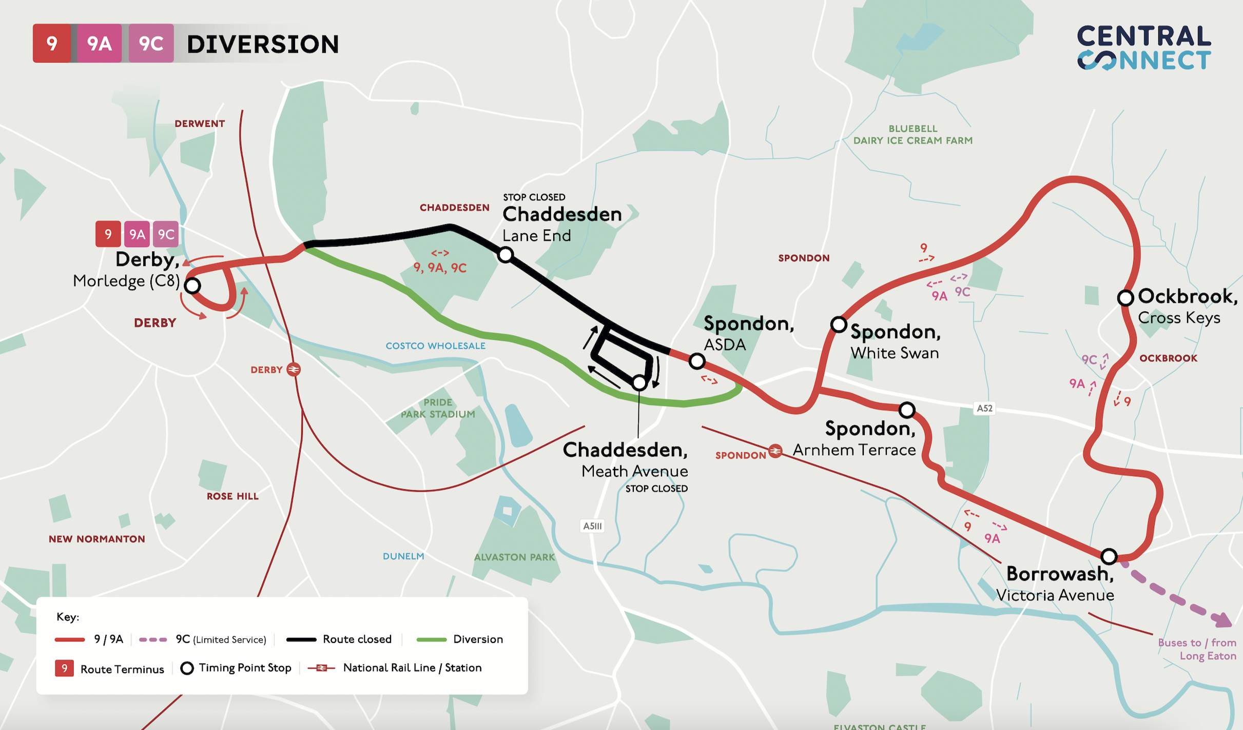 Buses will be unable to serve any stops between Derby City Centre and Spondon ASDA and will divert direct via the A52. Unfortunately there will be no service to Chaddesden or the Albert Road estate.