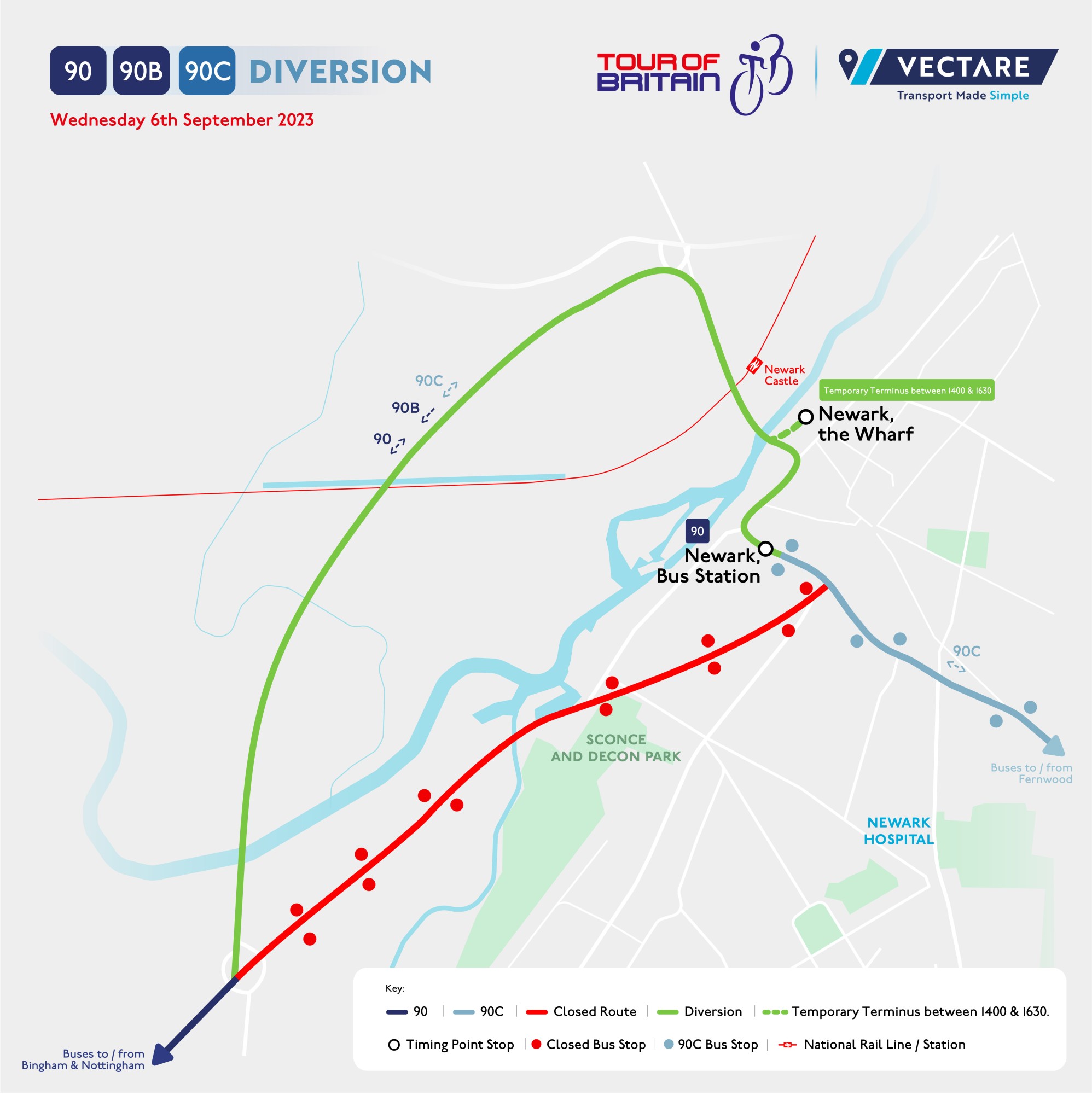 On Wednesday 6th September Stage 4 of the Tour of Britain Cycle Race will take place in the East Midlands, finishing in Newark. This will cause significant disruption to Service 90 (90B, 90C) throughout the day.