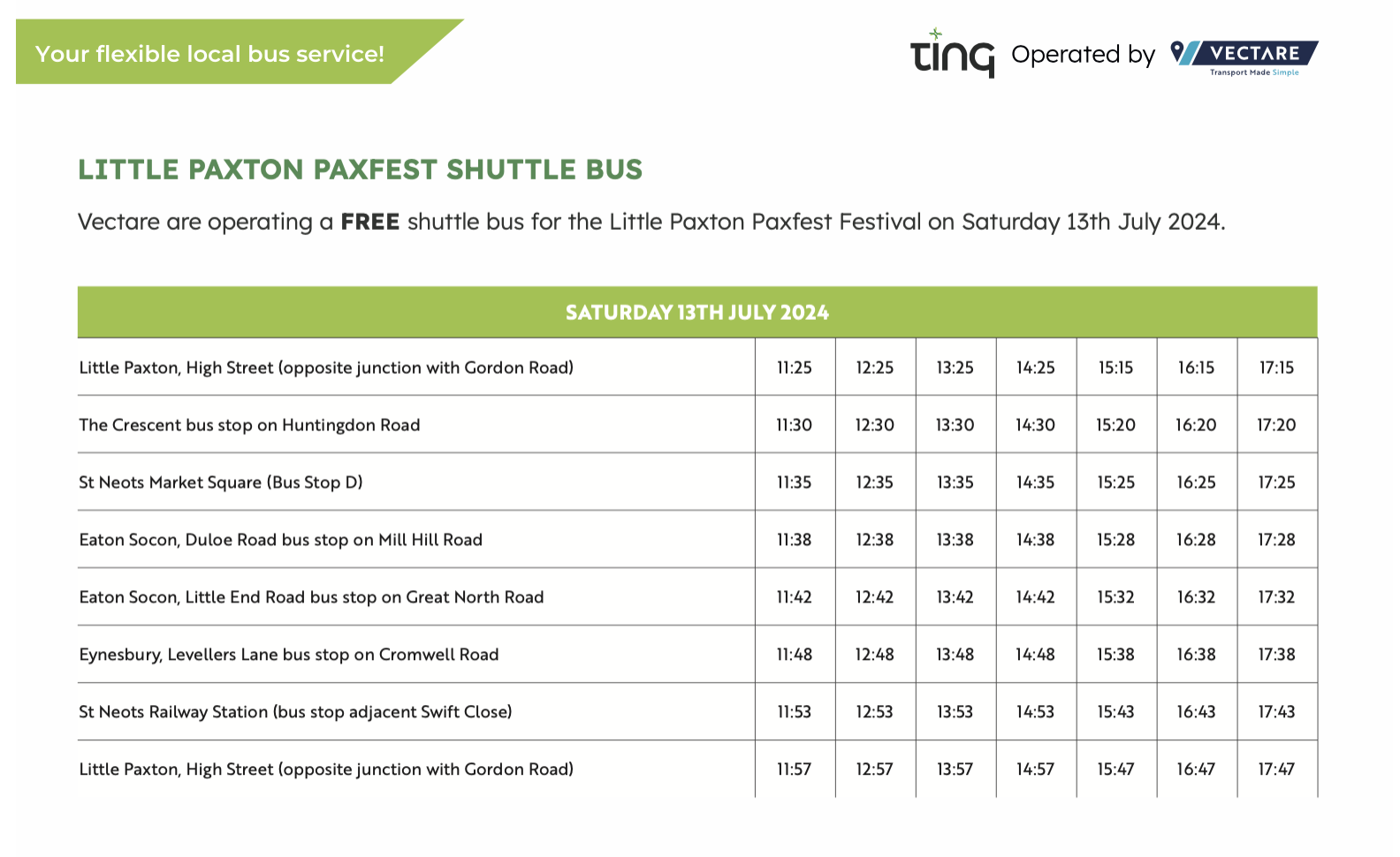 We are pleased to announce we'll operating a free shuttle service on Saturday 13th July to support the Paxfest event in Little Paxton. The service will be operated by one of our low floor, air conditioned vehicles with USB charges and seatbelts fitted.