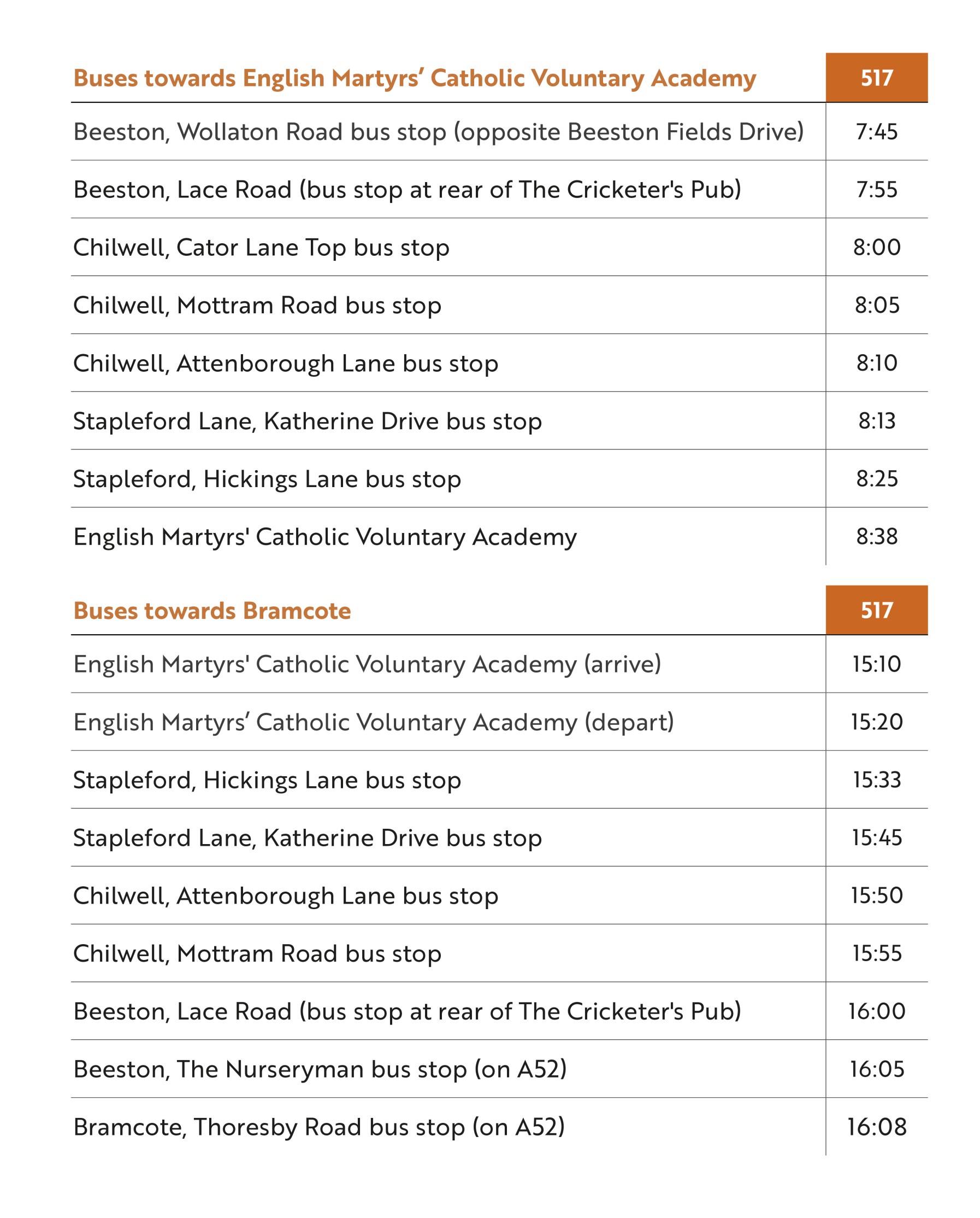 The 517 is a 'closed door' service and is not available to members of the general public. Only pupils attending English Martyrs' may use it.