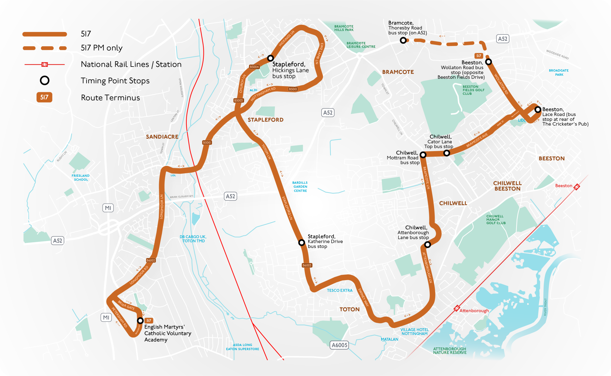 Vectare operate Service 517 on behalf of Nottinghamshire County Council. Service 517 runs from Beeston to the English Martyrs Catholic Voluntary Academy via Chilwell, Toton and Stapleford.