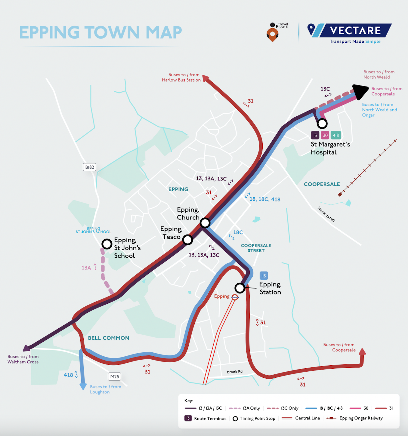 Vectare operate a small number of services around Epping town, centred around the Underground Station and High Road. A summary map of these services can be found below.