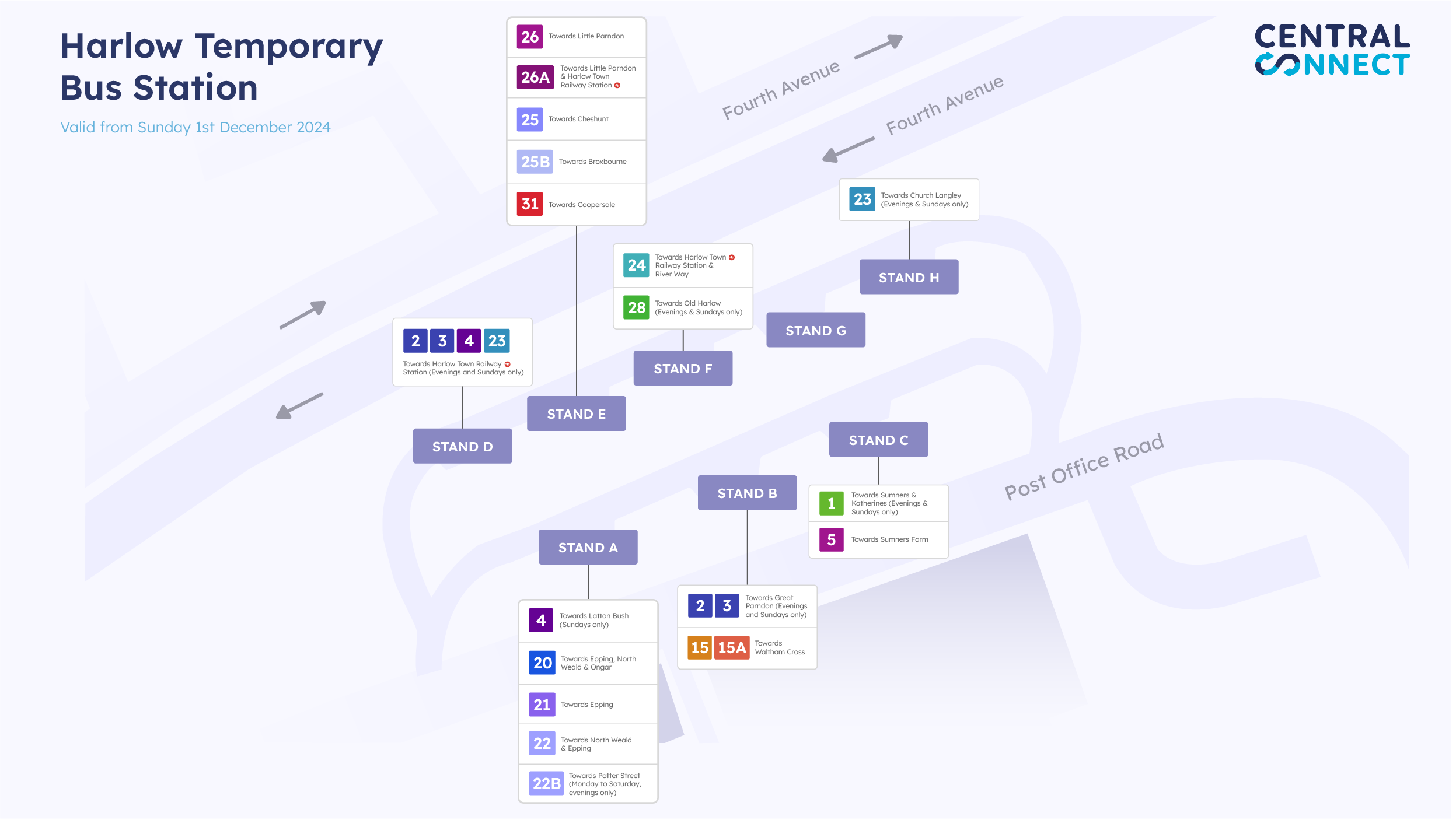 - Buses towards Great Parndon & Staple Tye will depart from Stand B.