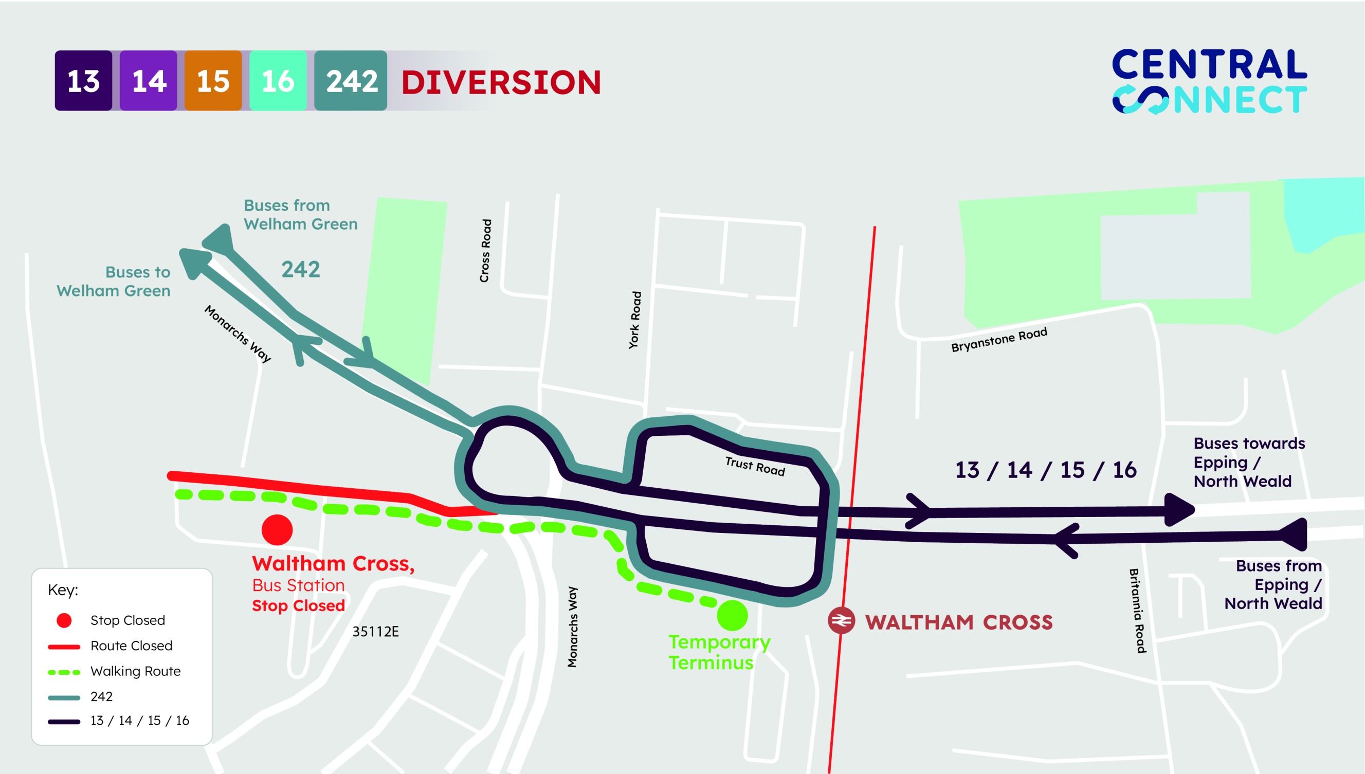 From Monday 7th April, for many, many weeks (until approx Nov 25), a series of roadworks are taking place outside, and on the approach too, Waltham Cross Bus Station which will significantly reduce the Bus Stations operating capacity. To facilitate these works all non-TfL services (except the Arriva 251) will temporarily transfer their terminus to the bus stands on Station Approach outside of Waltham Cross Railway Station.