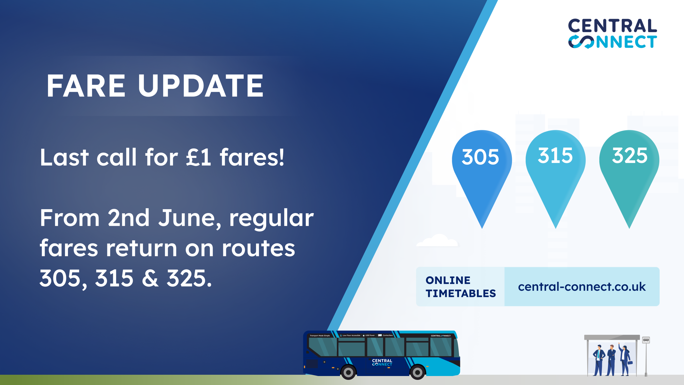 At the end of May 2025 our promotional £1 fares for all journeys on Services 305, 315 & 325 will come to an end and regular fares will commence from Monday 2nd June.