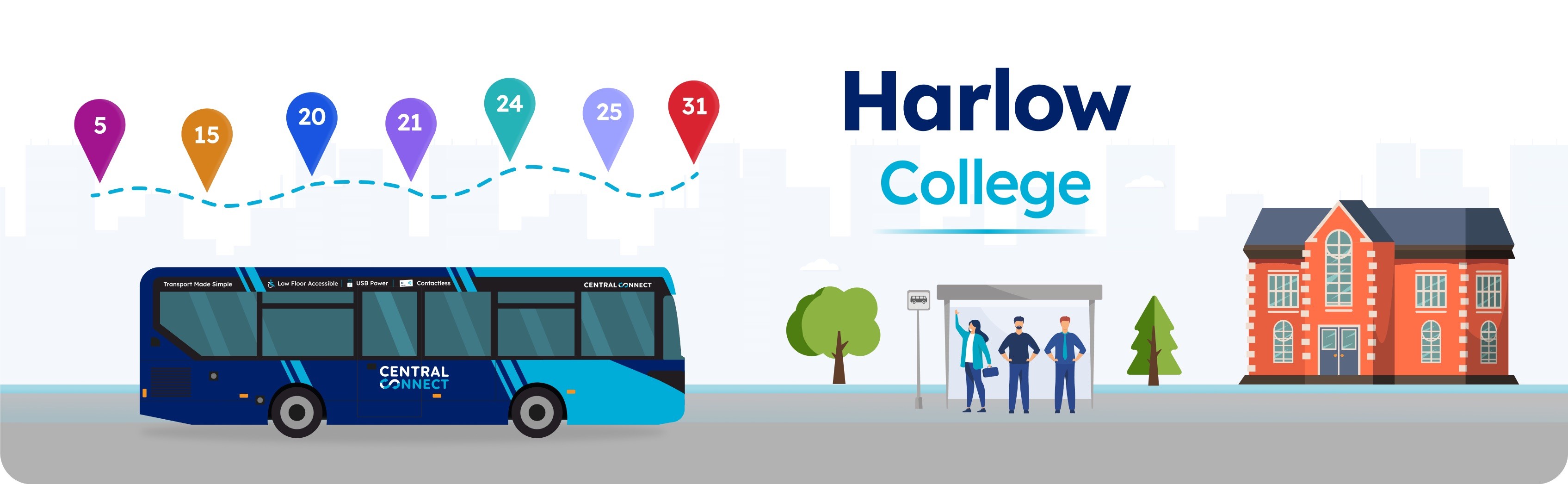 Students at Harlow College can take advantage of Central Connect U19 fares at all times. Pupils over 19 presenting a standard (bronze level) student card can also obtain this discount on services 5, 15, 20, 21, 24, 25 & 31.