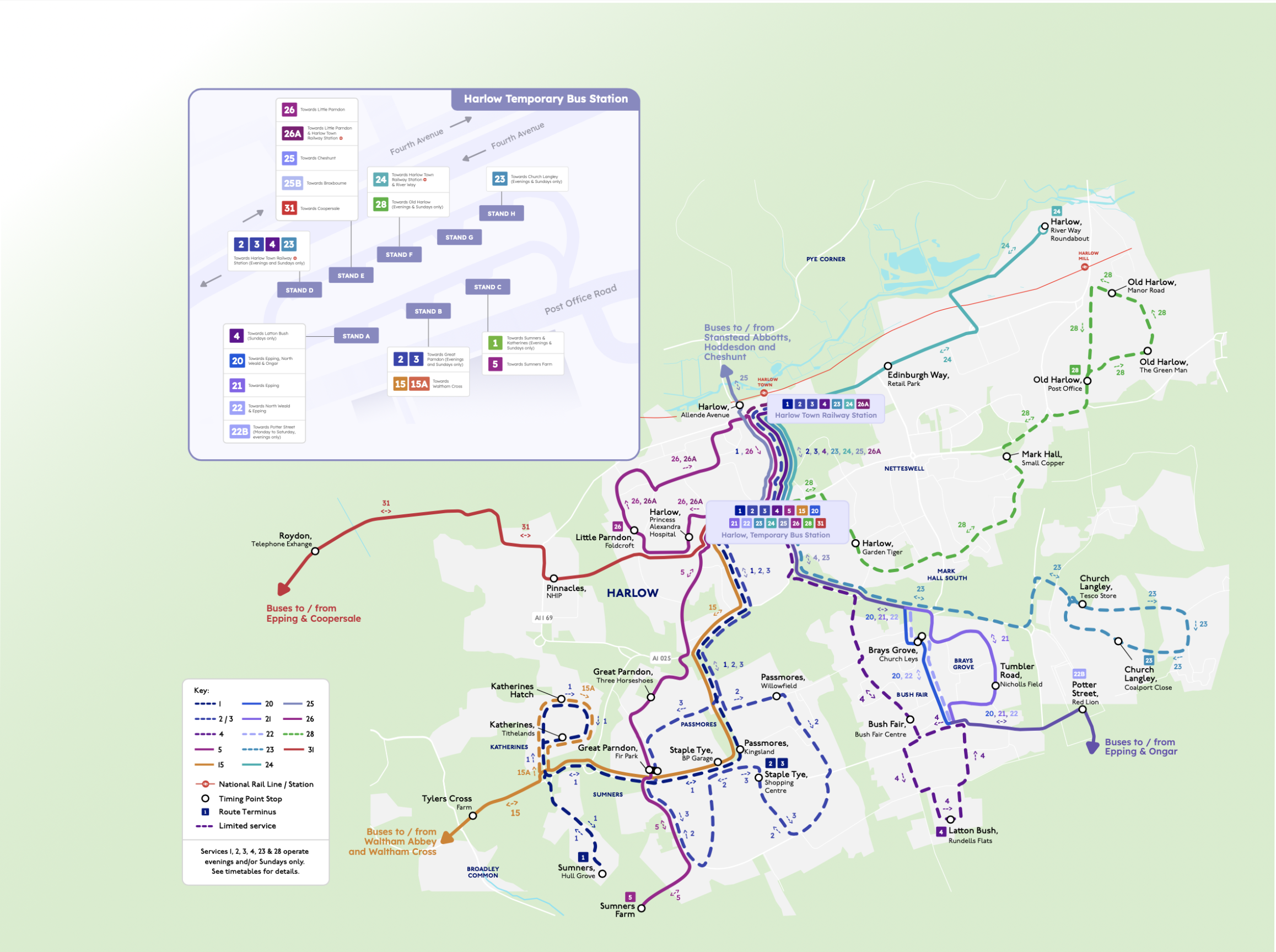 Central Connect operate a number of services within Harlow town. A summary map of these services can be found below, including the Temporary Bus Station.