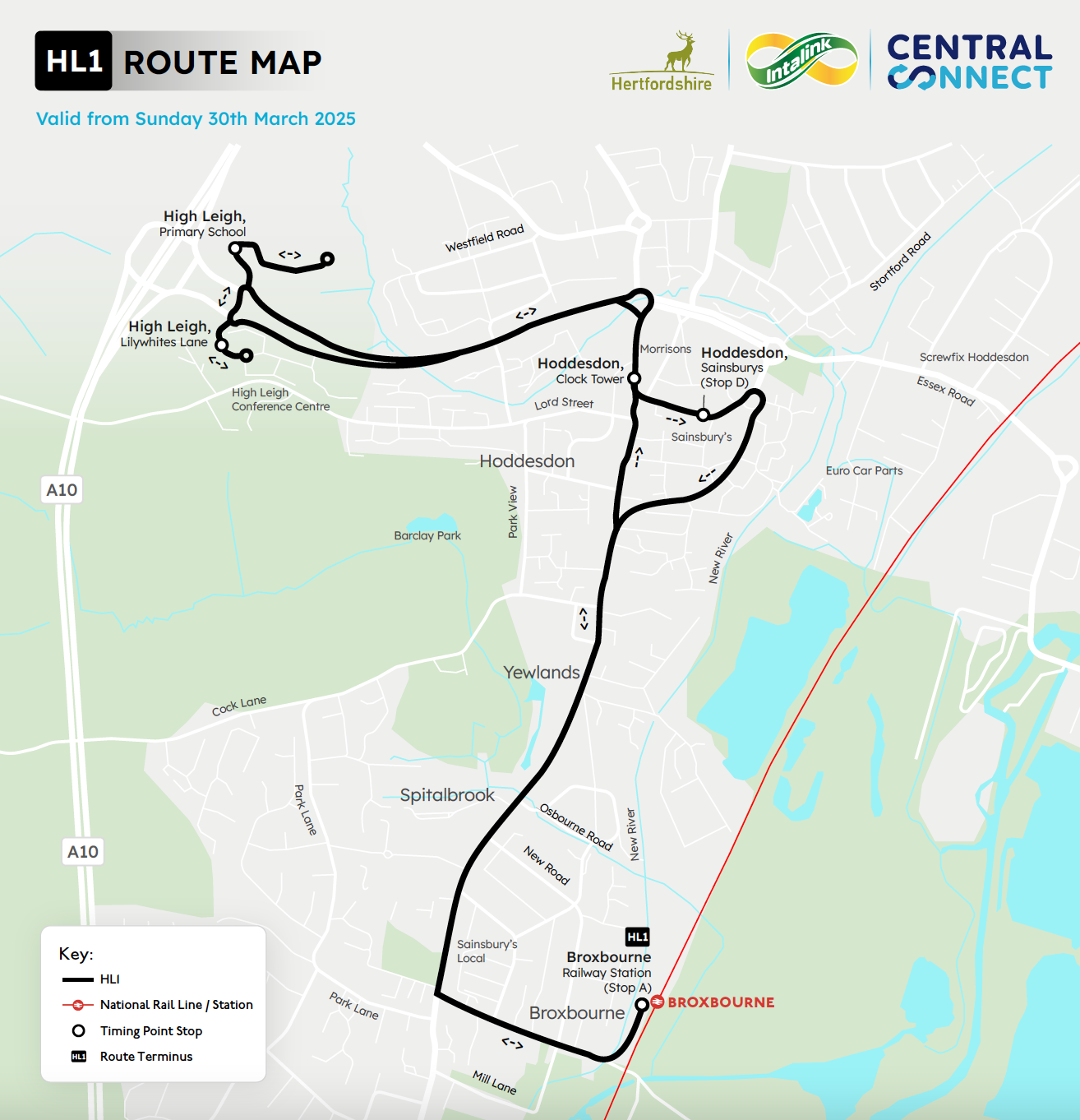 Service HL1 is delivered in partnership with Hertfordshire County Council, Taylor Wimpey and Greater Anglia. The route provides a fast frequent connection linking High Leigh with both the local amenities in Hoddesdon and rail links from Broxbourne Station into Liverpool Street and Stratford, as well to Cambridge and Hertford.
