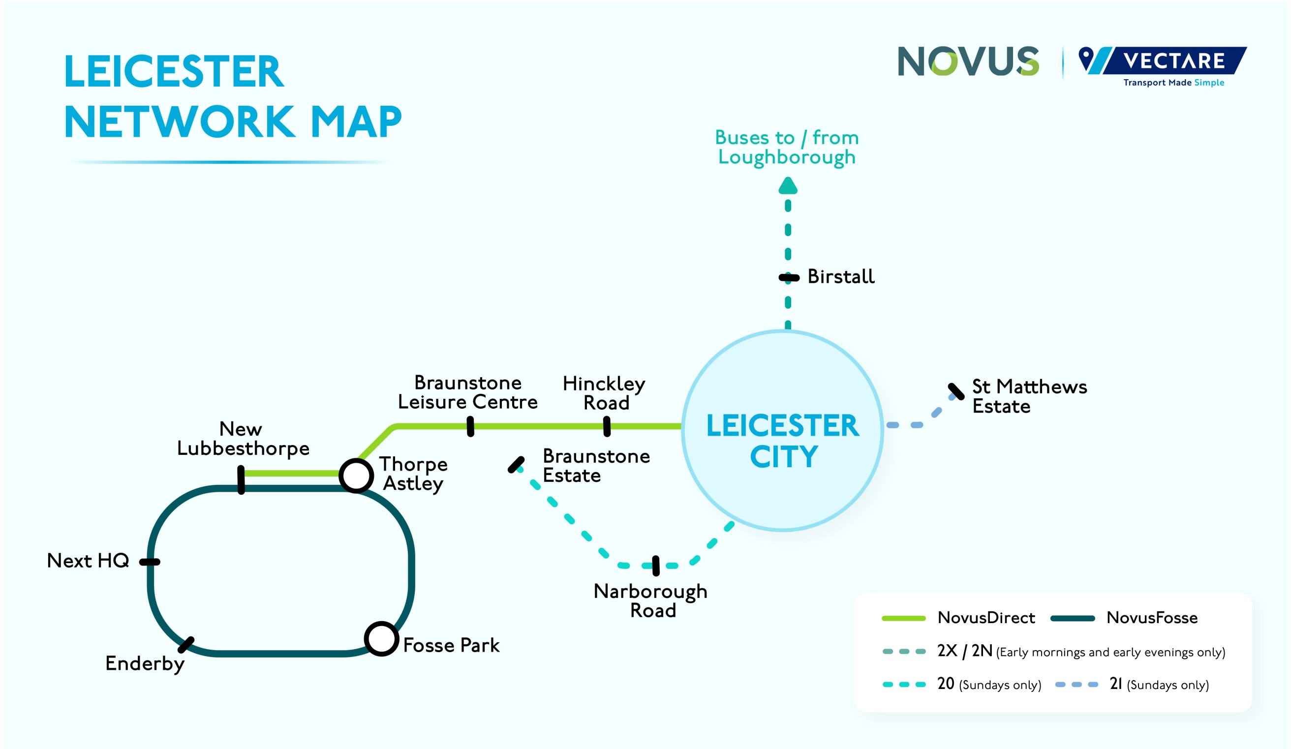Vectare operate a small network of services in Leicester predominantly under our Novus brand serving the New Lubbesthorpe area in partnership with GO Travel Solutions and the Drummond Estate.