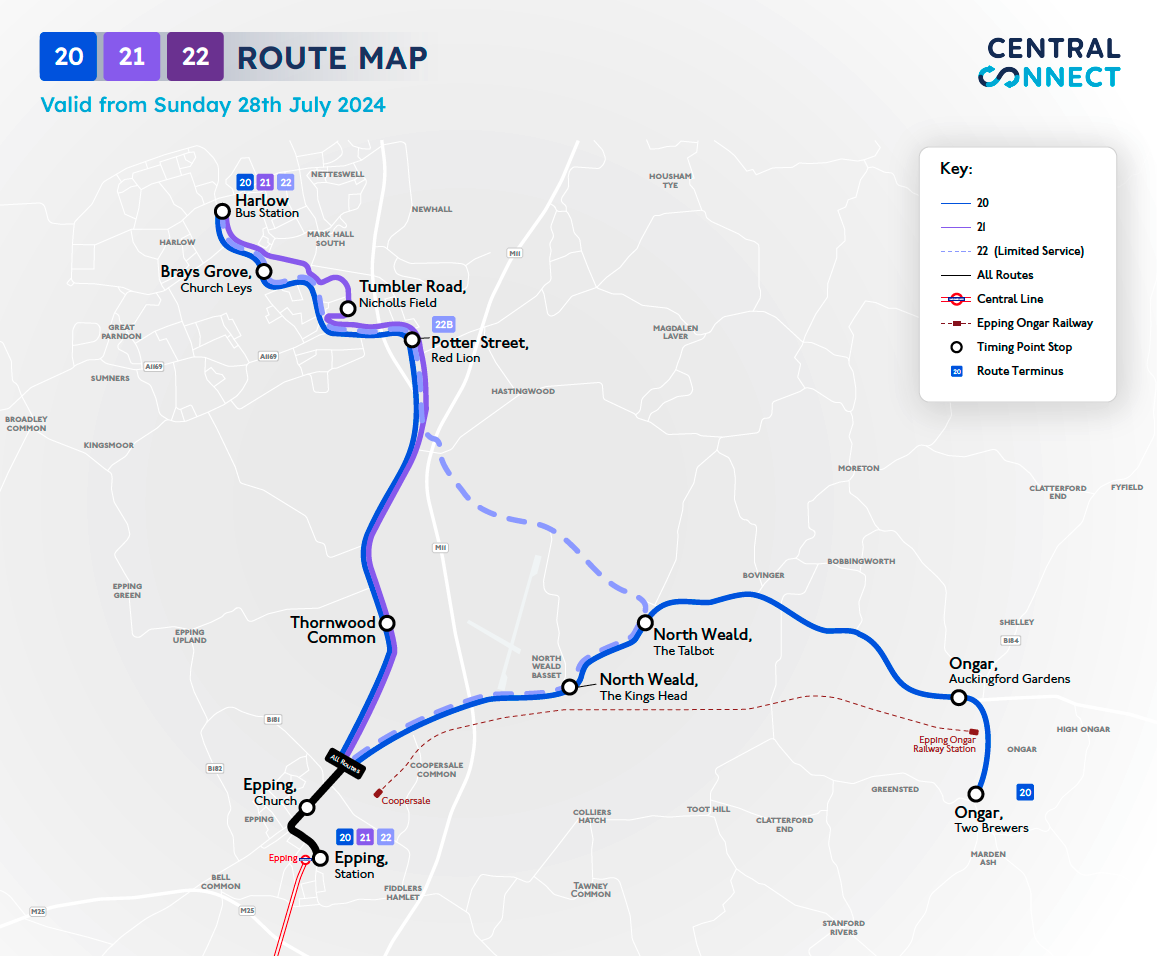 As part of our ongoing investment into the local bus networks around Epping, Ongar, North Weald and Harlow, we're making some significant changes to Central Connect Service 420 & 420A from Sunday 28th July 2024. We're implementing a range of enhancements across the service with new buses, new timetables, a new route section, new fares and new simpler numbers!