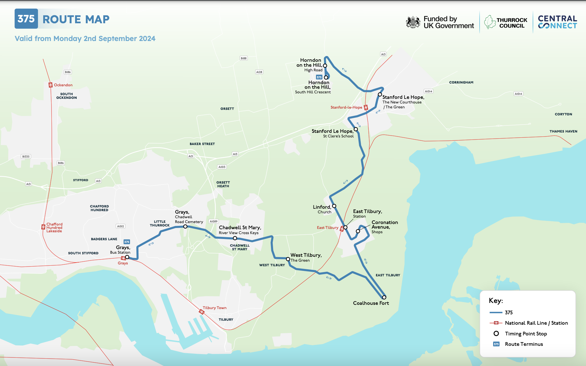 Central Connect are delighted to announce that we'll be introducing Service 375 in partnership with Thurrock Council with funding support from HM Government and the Thurrock Bus Service Improvement Plan.
